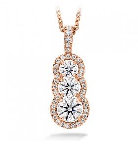 This Hearts On Fire Aurora Pendant features an 18k rose gold cable chain and round prong-set diamonds that decorate the blazing facade of this brilliant pendant.